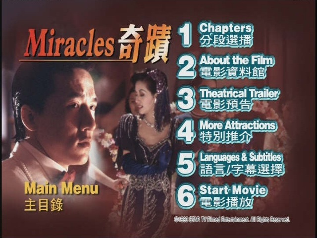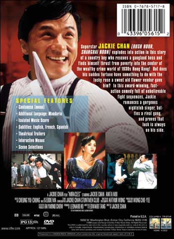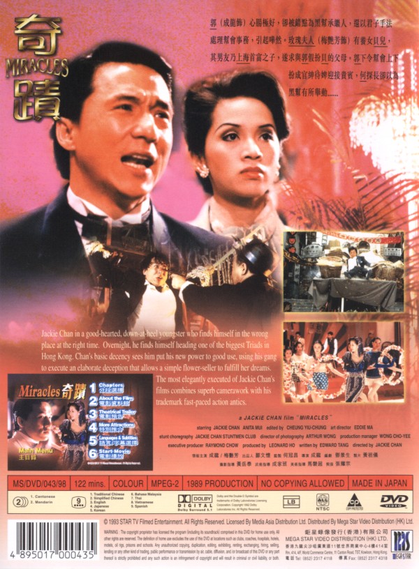 Starring: Jackie Chan, Anita Mui. A slapstick comedy starring Jackie Chan as a man caught between friendship and the law. His will is tested when asked by the cops to rat on his gang member friends. As always, Jackie's style shines through with lots of laughter and a few punches thrown in. Jackie's own personal favorite film! A.k.a. "Miracles." Written & directed by Jackie Chan.