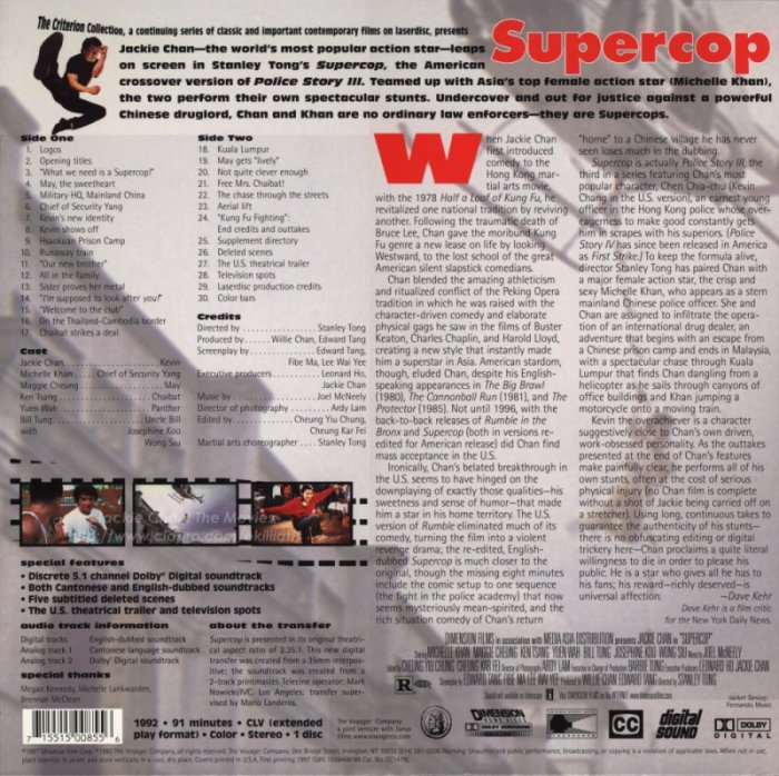 The original version of Police Story 3: Supercop! I have watched this version for the most part on my Criterion Laserdisc of this movie which contains the original audio track before Dimension added the Rap music and such to it. There is still a few scenes missing from my Criterion edition but are included a special feature. I recommend this version for the original soundtrack and dialog, and it being the original uncut movie. The video quality is not the best, it's not anamorphic and not as clean as the Dimension US release, but it does have it's benefits.