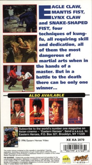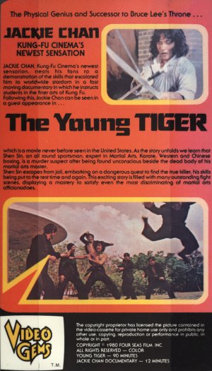 Right on the front cover you can see the deception. "The Young Tiger, A Four Seas Film, Featuring Jackie Chan." Then it goes on to say, "The physical genius and successor to Bruce Lee's Throne, Jackie Chan, Kung-Fu Cinema's Newest Sensation." They make it seem like this movie is a Jackie Chan movie. But in small print at the bottom you see, "Starring in a 12 minute documentary demonstrating the kung-fu skills that escalated him into worldwide stardom." Hey wait that means Jackie is not in the movie at all. Even though his face is shown bigger than the other two actors on the front cover. Definitly a "leave at the video store" movie.