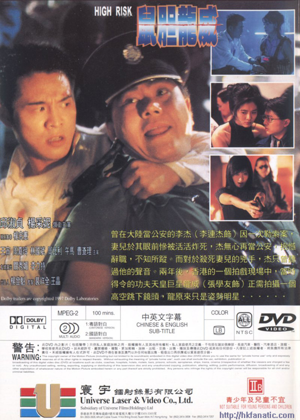 An anamorphic version of High Risk, but is it any good? With the other great releases by Columbia-Tristar recently including the Once Upon a Time in China series available in the original language (Cantonese) with English subtitles I would expect a very good release. Unfortunatly it is a disappointment as it contains only a redone English dub with more Rap music like Jackie Chan's Supercop. When will the carnage of our beloved Hong Kong movies stop?